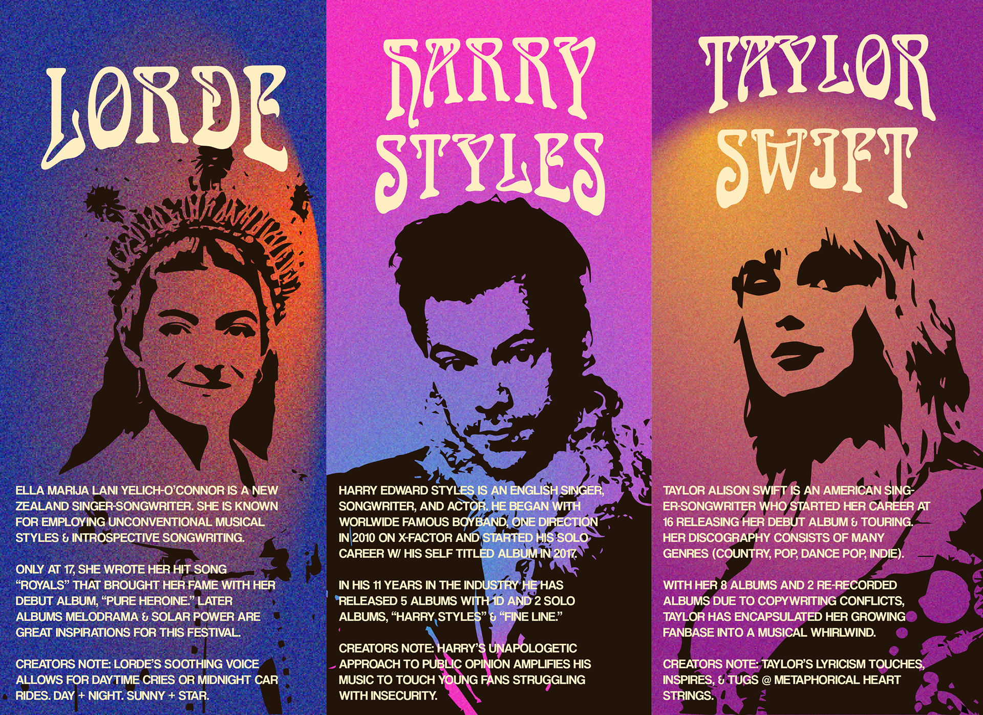 In my first semester at USC, I was eager to learn the ropes of the Adobe Suite (to venture outside my high school Canva graphics). In PR 486 Multimedia PR Content: Intro to Digital Design, I applied these new skills to create and design a PR package for a faux record company's festival.
